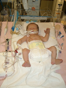 Vervolgens ben ik met de kinderarts mee gelopen naar de intensive-care waar Thijn door een cardioloog is onderzocht. (dokter Delhaas) Die kwam na lange tijd met het nieuws dat er met Thijn meer aan de hand was dan dat we in eerste instantie verwacht hadden. Hij kreeg dus ook onmiddellijk het medicijn Prostin om zijn ductus open te houden. Dit was voor ons de eerste tegenvaller na de geboorte. Het onderzoek zou de volgende dag vervolgd worden. Met een 2de cardioloog erbij zouden ze een diagnose stellen.