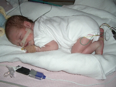 We zijn ‘s morgens naar onze Thijn gegaan om te kijken hoe hij de nacht had doorgebracht. Volgens de zuster had hij lekker geslapen. Hij deed voor het eert na de operatie zijn oogjes weer open. We hadden dinsdag te kennen gegeven dat we graag met de cardioloog een gesprek wilden hebben, om het verloop van de operatie met hem te bespreken. Daarop had men nog geen reactie ontvangen, maar ze zouden direct even contact op nemen met cardiologie. Die kon ons melden dat hij binnen 10 min. bij ons zou zijn. De cardioloog vertelde ons dat de operatie goed gelukt was, maar dat het allemaal bij elkaar wel een hele klus is. “Zo’n operatie baart menig chirurg echt kopzorgen”, zei hij. Ze hebben nu dus een bandje rond de pulmonales (longslagader) gezet en ze hebben de aortaboog verbreed (coarctatio aorta). Tevens heeft men de ductus verwijderd. Ze hebben meteen een drain geplaatst om het wondvocht af te voeren, maar die gaat er na verloop van tijd weer uit, afhankelijk van het herstel van Thijn. Als nu alles goed gaat, kunnen ze de medicijnen af gaan bouwen en de voeding weer opstarten. Wel is men na de operatie meteen gestopt met het medicijn prostin, wat dient om de ductus open te houden, omdat dat nu niet meer nodig is. De zuurstoftoevoer via de beademing, die hij nu nog nodig heeft, wordt langzaam verminderd en zal in de loop van de week verwijderd worden.
