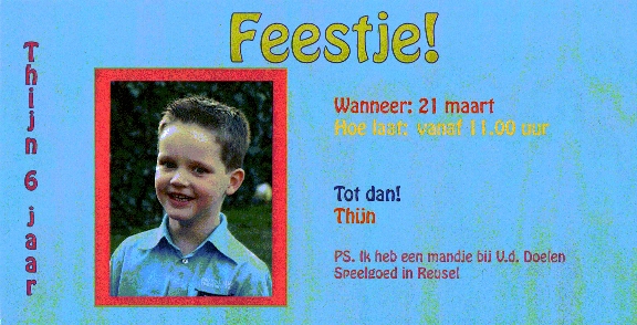 Maandag 21 maart 2005 is Thijn 1 jaar geworden. De uitnodigingen worden tijdig verstuurd en het feest kon beginnen. S’ morgens waren Nicole en Thijn als 1e van de partij, gevolgd door oma Loonen. Na volop gespeeld te hebben is het tijd voor je bed. Je was zo vertrokken naar dromenland. Na een lange middagdut ben je er weer helemaal klaar voor. De hele kamer zat vol visite. Iedereen komt je feliciteren.
