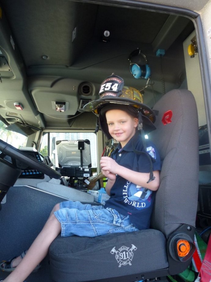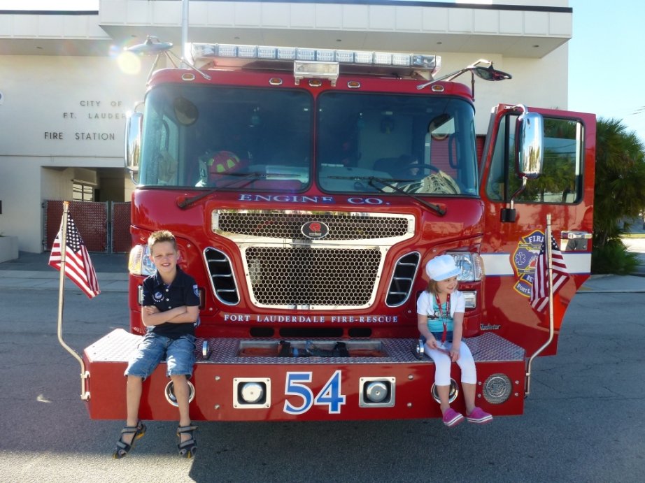 Vanmorgen eerst een bezoekje gebracht aan de brandweerkazerne van Fort Lauderdale. Ze mochten in de brandweerauto’s zitten. Ze kregen zelfs echte brandweerhelmen op. Wat zijn die brandweerauto’s toch mooi! Echt geweldig. Ze hebben hun ogen uitgekeken.