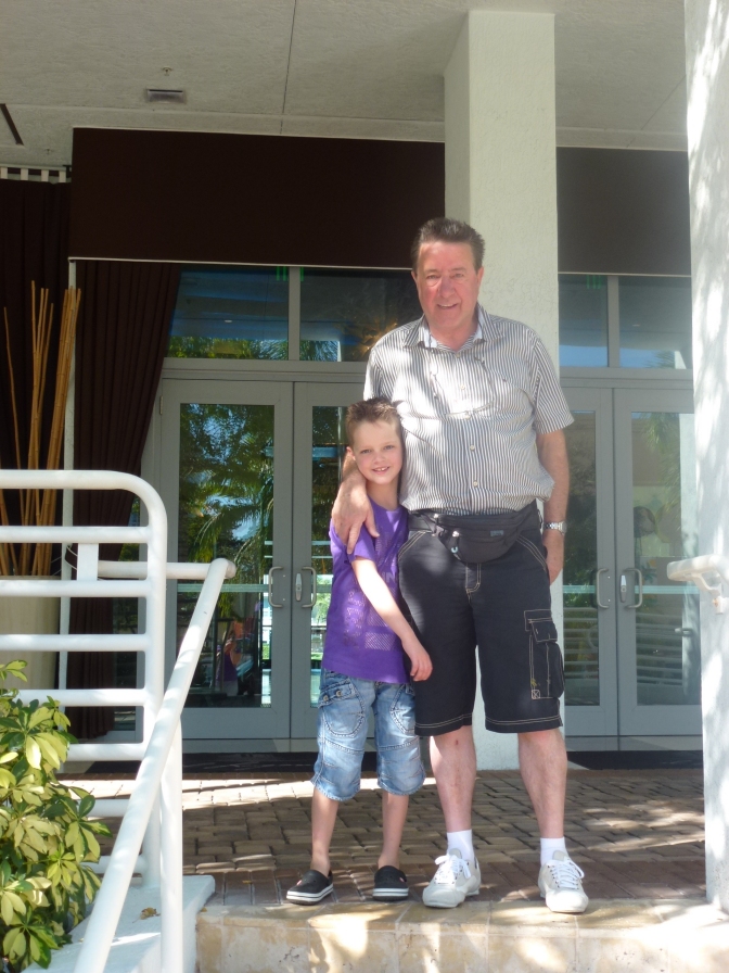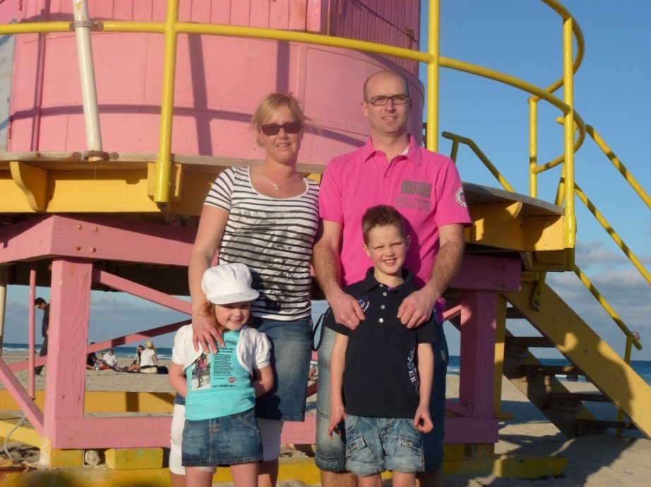 Gisterenavond zijn de kids vroeg naar bed gegaan. Alleen Thijn vond het toch wel spannend, om 22.30 uur was meneertje dan ook klaar met slapen. Uiteindelijk is hij om 1.15 uur toch nog even in slaap gevallen. Na ruim 2 uur moest hij er toch weer uit. Om 4.30 uur zijn we naar Moergestel gereden en zijn we met de taxi naar Dusseldorf gegaan. Even inchecken en nog even de tijd doorbrengen met hangen en vliegtuigen kijken. Om 8.50 uur was het tijd om aan boord te gaan. Thijn mocht samen met ons en onder begeleiding van Air Berlin als eerste het vliegtuig in. Dit omdat hij zijn rolstoel bij had, had hij toch echt een voorkeurspositie. Het opstijgen en landen was toch wel een beetje spannend. 10 ½ uur hebben ze zich goed vermaakt. Een beetje spelen, slapen, nintendo-en, op de ipad en ipod. Thijn heeft tijdens de reis wel wat last gehad van zijn spieren en van de warmte in het vliegtuig. Het was erg warm en klam in het vliegtuig. Een hele belevenis voor de kids. Om 20.30 uur (Nederlandse tijd) zijn we weer geland. Ook in Miami op de luchthaven hebben we een voorkeursbehandeling gekregen. Meteen uit het vliegtuig stond er weer begeleiding te wachten en werd Thijn geduwd door een luchthaven medewerker. Ook heeft deze man ervoor gezorgd dat we niet in de lange rij hoefden te staan voor de vingerafdruk ken en foto. Ook de douane controle was zo gepiept. Ooit toch wel makkelijk zo’n rolstoel. Even de auto ophalen en dan naar het hotel. Om 0.30 uur (Nederlandse tijd) arriveren we bij het hotel. In Amerika is het 6 uur vroeger.