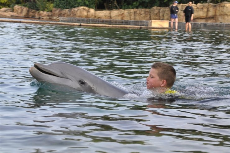 Eerst gaan we Discovery Cove verkennen. Er is een heel warme baai (geen echte alles is nagemaakt). Daar lekker even gezwommen. Het was niet zo warm vandaag dus dan is zo’n warme baai wel erg fijn. We hebben vandaag een all-inclusive programma en mogen de hele dag eten en drinken. Alleen hebben we daar niet zo veel tijd voor. Na de lunch zijn we gaan snorkelen. Je snorkelt dan tussen de vele soorten tropische vissen en roggen. Voordat je het weet sta je oog in oog met een rog van ruim een meter doorsnee. Erg indrukwekkend. Dit is ook helemaal Thijn z’n ding. Achter glas zwommen veel haaien en ook verschillende soorten haaien. Het lijkt dat ze in het zelfde water zwemmen, maar gelukkig zat er een glaswand tussen. Imme moest er in eerste instantie niet veel hebben van het zoute zeewater. Dit kwam mede omdat ze een schaafwondje had op haar knie. Eenmaal in het water ging ze met haar duikbril op rond kijken. Ze had heel veel vissen gezien en een paparog, mamarog en babyrog. Zo vertelde ze dat. Ze heeft er zo van genoten. Daarna nog even een klein hapje eten en dan is het tijd om met de dolfijnen in contact te komen.