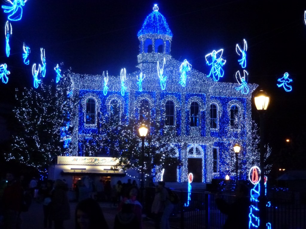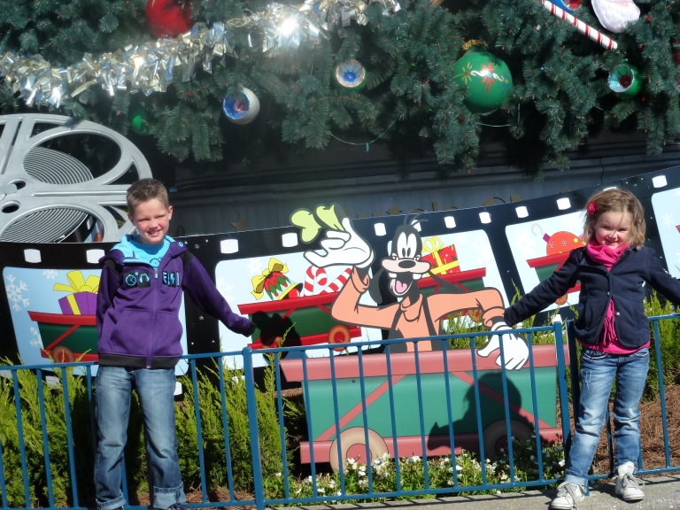 We zijn in een attractie gegaan die toch wel behoorlijk heftig was. Je zat op een bank in een lift en de lift had regelmatig een vrije val. Na de vrije val ging de lift weer omhoog om weer in etappes met vrije val naar beneden te gaan. In deze attractie zaten ook enge stukken. Thijn vond het spannend maar ook wel leuk. Hij vindt de attractie op zich erg leuk, alleen het verhaal (met geesten) niet. Imme vond het echt eng. Ik moet wel zeggen dat ze niet gehuild heeft. Dit had ik wel verwacht toen we er in zaten. Om 18.30 uur was er een Fantastic show. Een show met veel water, licht en geluid. Veel disney figuren zijn hierbij ook betrokken geweest. Het was een geweldige show. Daarna nog even het park in geweest om naar de lichtjes te kijken. Een gedeelte van het park was met kerstverlichting verlicht. Het was een mooie kleurrijke bedoeling. Dat kun je zien op de foto.