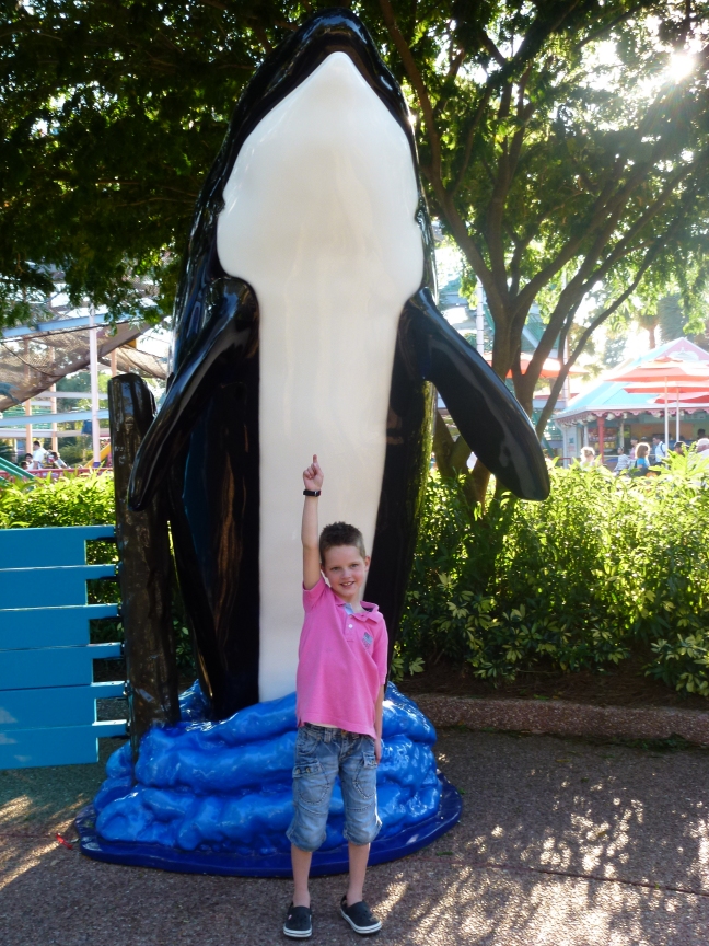 Een dagje Seaworld. Het is vandaag een koude dag. Het waait behoorlijk en de temperatuur is niet echt hoog. We hebben maar verschillende laagjes kleding over elkaar aangedaan. De orka show is helemaal geweldig. Met 4 orka’s vertonen ze verschillende kunstjes. Het nat spetteren van het publiek is toch wel een erg leuk kunstje. En goed dat ze dat kunnen. Ze verplaatsen heel wat water. Als je vooraan zit loop je dus wel degelijk een groot risico dat je nat wordt. Orka’s zijn machtig, grote dieren. Er zwom zelfs een baby orka mee. Het is knap dat zo’n orka al een gedeelte van de show meedoet.
