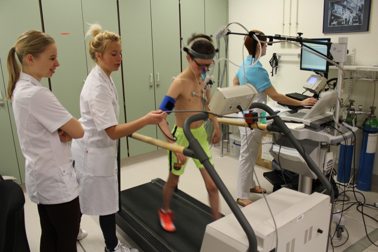 Vanmorgen om 9.00 uur moest Thijn zich melden voor de inspanningstest. Hij heeft deze test ook nuchter moeten ondergaan, i.v.m. de hartkatheterisatie nadien. Ongeveer 20 minuten heeft hij zich moeten inspannen op de loopband. De loopband werd iedere keer zwaarder ingesteld en ook de hoogte/ stijlheid werd steeds anders ingesteld. Hij heeft een berg moeten beklimmen van 14%. Aan het einde van de inspanningstest was hij doodop. In de inspanningstest heeft hij erg goed gedaan. De uitslagen en overige gegevens worden doorgezet naar Prof. Gewillig (kindercardioloog).
