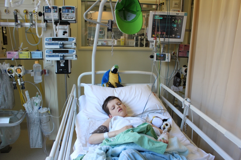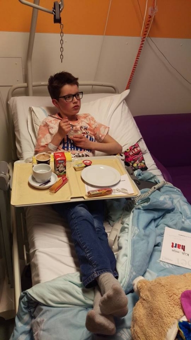 De verpleegkundige had al meerdere malen gezegd dat het infuus nog niet verwijderd mocht worden. Maar Thijn bleef er maar om mopperen en het spookte in zijn hoofd dat hij met het infuus niet kon slapen. Ik ben toch nogmaals naar de verpleegkundige gegaan en gevraagd of het echt niet eruit mocht. Heb de nadruk op het psychische vlak gelegd en toen hebben ze besloten om het infuus te verwijderen. Thijn helemaal happy en ik ben zijn allergrootste held.
